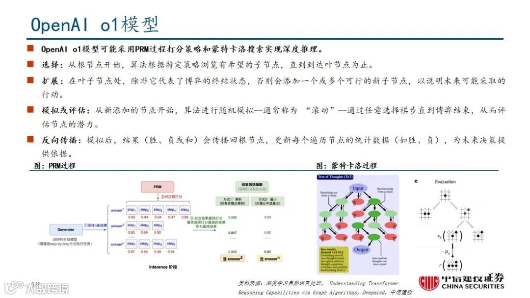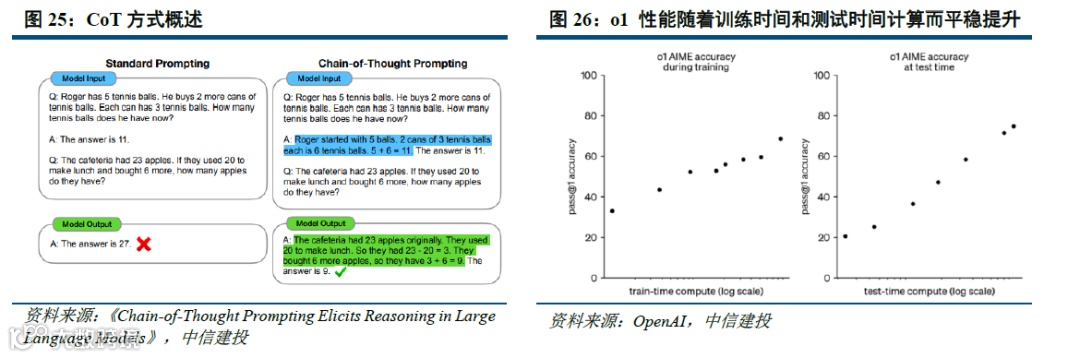 思维链等方式打开推理侧大模型能力提升空间。当训练侧“Scaling law”进度相对放缓,OpenAI于2024年9月发布了系列新模型o1,其利用强化学习技术,通过提高推理侧的思考时间,大幅优化了模型表现;还能够在训练过程中生成高质量数据,解决天然数据缺失的问题。以思维链技术为例,其类比人类思考过程,使大模型在推理过程中把复杂问题拆解成若干简单步骤,从用户提出的问题出发,逐步生成正确答案。OpenAI o1模型性能随着训练时间和测试时间计算而平稳提升,后训练及推理阶段思考深度(时间)或将成为 新的“Scaling law”;相较于OpenAI未开源推理算法,DeepSeek-R1系列模型提供了RL Scaling Law的可行方向,有望促进各厂商跟进并继续探索其他推理侧拓展方向。