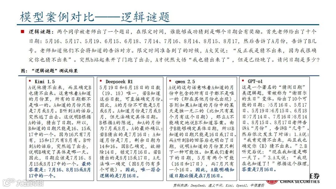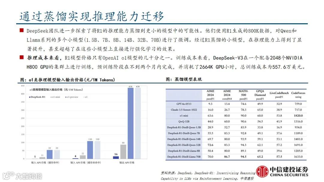 蒸馏使小模型具备较强逻辑推理能力的思路或与OpenAI o1-mini不同。据张俊林分析,o1系列模型更可能是重新训练的(OpenAI多次强调o1-mini逻辑推理能力强,但在世界知识方面弱;如果其基于GPT系列模型而来,世界知识应该不会弱于GPT 4o-mini),而DeepSeek-R1则是在V3的基础上通过强化学习训练得到。因此,DeepSeek通过向更高效的小模型蒸馏DeepSeek-R1的输出,显著提升小模型推理能力,更可能走出了与OpenAI o1-mini不同的道路,从而实际上打破了之前“小模型逻辑推理能力难以通过蒸馏提升”的研究结论。
