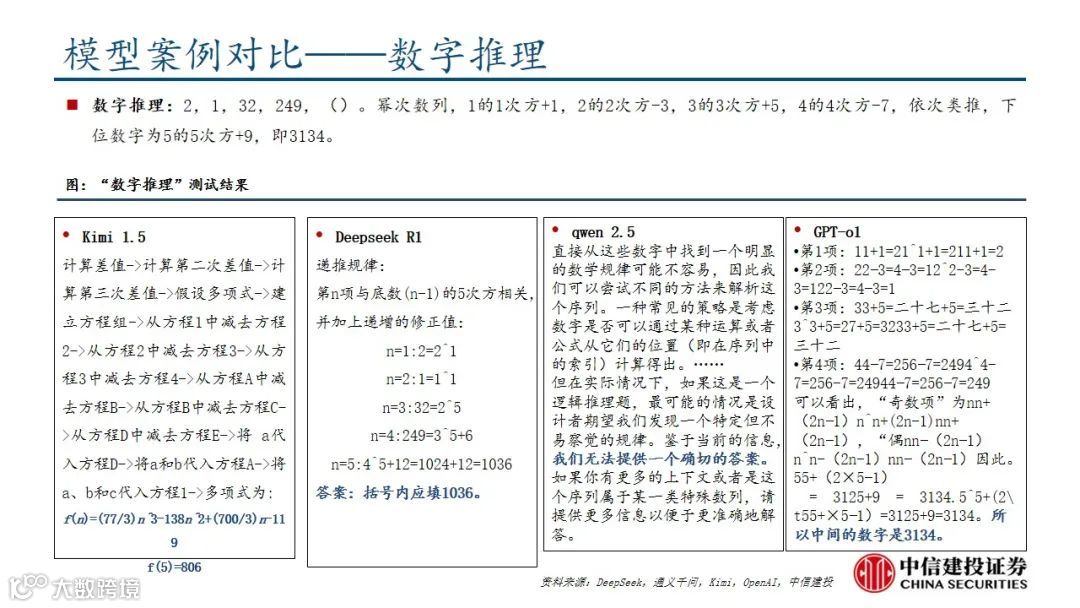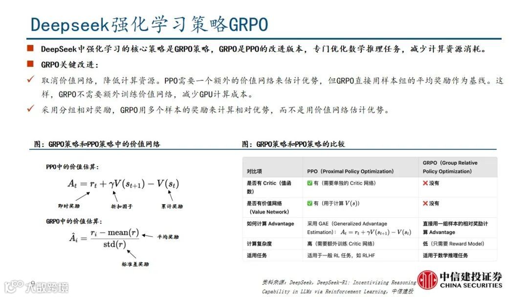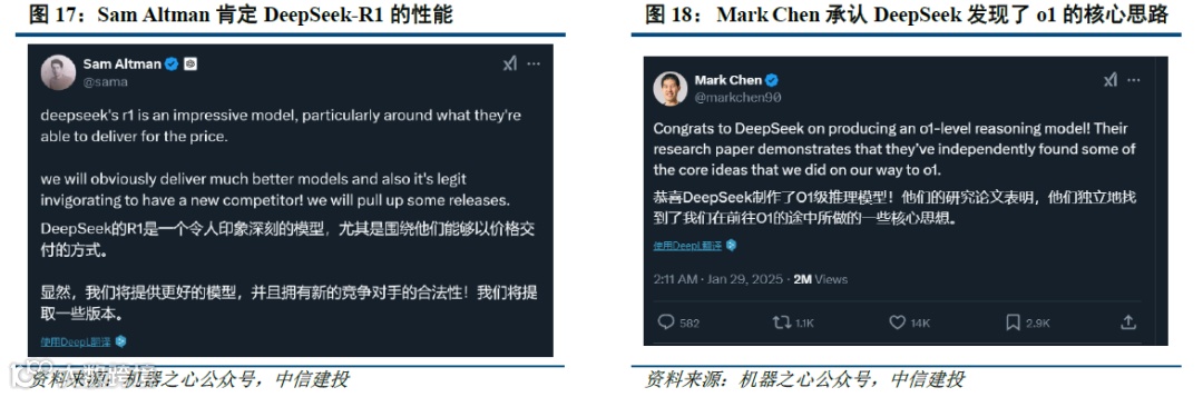 我们认为,DeepSeek-V3/R1系列模型的核心突破在于1)技术及架构升级显著优化模型训练成本,即工程优化了MoE模型架构,预计未来各厂商仍将围绕MoE模型进行注意力头的架构优化;2)组相对策略优化算法(GRPO)实质上仅依赖模型自身近些迭代,实现了“反思能力”;3)提供了一种具体可行的“RL Scaling law”方向,各厂商或将跟进并继续探索其他方向;4)蒸馏使小模型具备较强逻辑推理能力,有望促进中小型开发者推出相关应用。