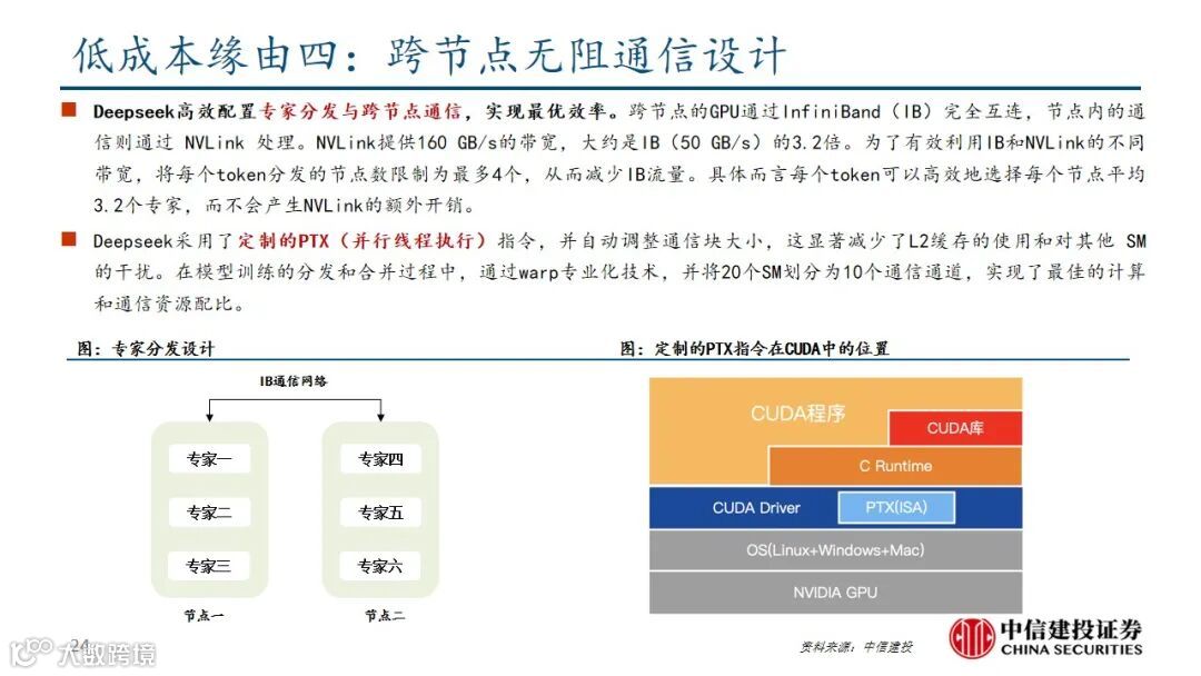 除了基础架构,DeepSeek还在基础设施方面进行了一定优化。例如设计了一种创新的管道并行算法 DualPipe,在每一对前向和后向块内重叠计算和通信,提高通信效率、加速了模型训练;提出了一种用于 FP8 训练的混合精度框架,其中大多数计算密集型操作在 FP8 精度下进行,而一些关键操作则战略性地保持在原始数据格式以平衡训练效率和数值稳定性;训练过程中,采用英伟达 PTX(并行线程执行)汇编级编程替代标准 CUDA 方案,实现了硬件级深度优化,减少了计算冗余,提高了推理速度。
