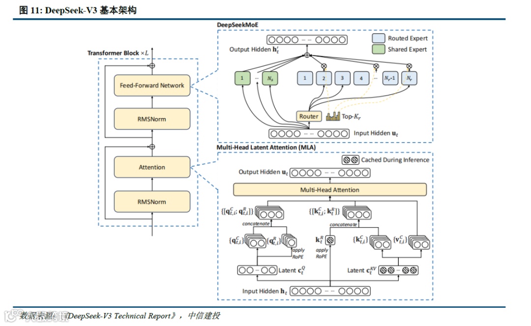 多头潜在注意力(MLA):LLM的核心机制是自注意力(Self-Attention),其要求模型在生成每个token时考虑之前所有词的关系,则假设文本长度n时总体复杂度为〖O(n〗^3)=O(Σn^2);过去的研究提出了KV Cache方法,利用键值对(KV)存储已计算的注意力信息,此时总体复杂度降低为O(n^2);而MLA则进一步通过投影的方式,将token的相异信息通过投影矩阵存储,在几乎不损失信息的情况下减少键值的缓存需求。