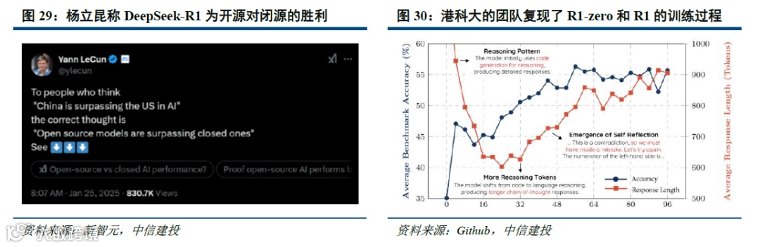 DeepSeek-R1开源引发全球复现热潮,小模型+RL实现“反思”涌现。在美国对中国实施 AI 芯片封锁的背景下,DeepSeek以极低的成本成功训练出跻身全球第一梯队的推理模型 R1。同时,DeepSeek 完全开源了模型权重,所遵循的 MIT License 开源协议极为宽松,允许其他开发者将模型用于商业用途并进行模型蒸馏,被Facebook首席人工智能科学家杨立昆誉为“开源模型对闭源模型的胜利”。