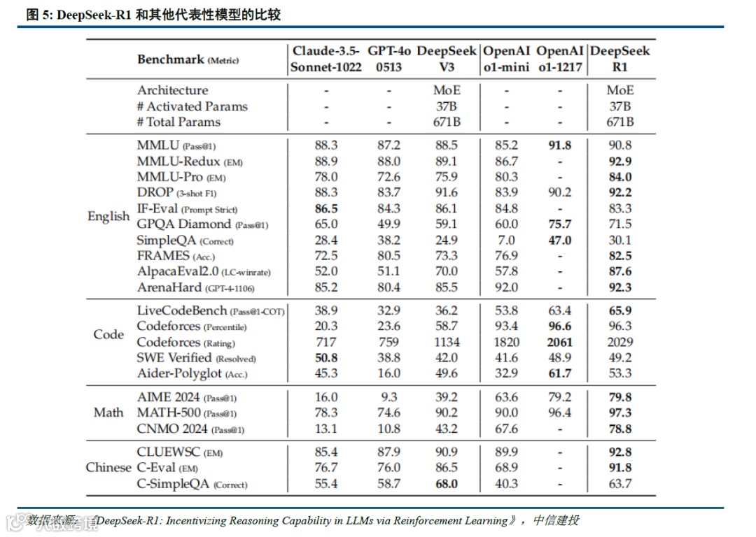 DeepSeek-R1 在推理任务上基本实现与 OpenAI-o1相当的性能,较o3模型仍有差距。DeepSeek在R1模型的测试过程中,选取英文、中文、数学、代码等基准测试,与Claude-3.5、GPT-4o、DeepSeek-V3、OpenAI o1、OpenAI o1-mini等模型进行比较: