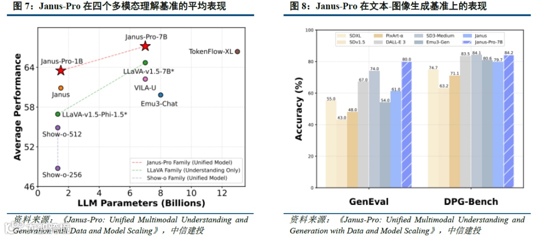 我们认为,多模态模型整体仍处于技术探索过程中,Janus系列核心在于提供了一种理解和生成解耦的架构,一定程度提升了模型表现,后续自回归和DiT技术将进一步发展,带来多模态模型性能的持续优化。