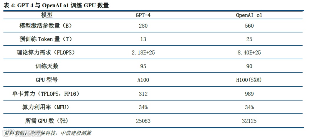 根据我们测算,GPT-4需要2.5万张A100训练95天(5700万A100 GPU小时),OpenAI o1需要用3.2万张H100训练90天(6912万H100 SXM GPU小时):1)GPT-4由16个111B的MoE模型构成,其中两个用于向前传播,另有55B被用做注意力机制的共享,则GPT-4的激活参数量约为280B,我们假定o1模型激活参数量是GPT-4的两倍,达到560B;2)GPT-4的预训练数据集token量为13B,我们假定o1模型接近其两倍,达到25B;3)GPT-4的训练时间约为90-100天,我们取中间值95天,并假定o1的训练周期为90天;4)GPT-4的GPU利用率在32%到36%之间,我们取中间值34%,并假定o1 GPU利用率也为34%;5)根据OpenAI在Scaling Laws 论文中给出的经验公式计算(C = rT ≈ 6*P*D,P为模型参数量,D为训练集token大小,r为训练集群硬件FLOPS总吞吐),则OpenAI o1预训练需要用3.2万张H100。