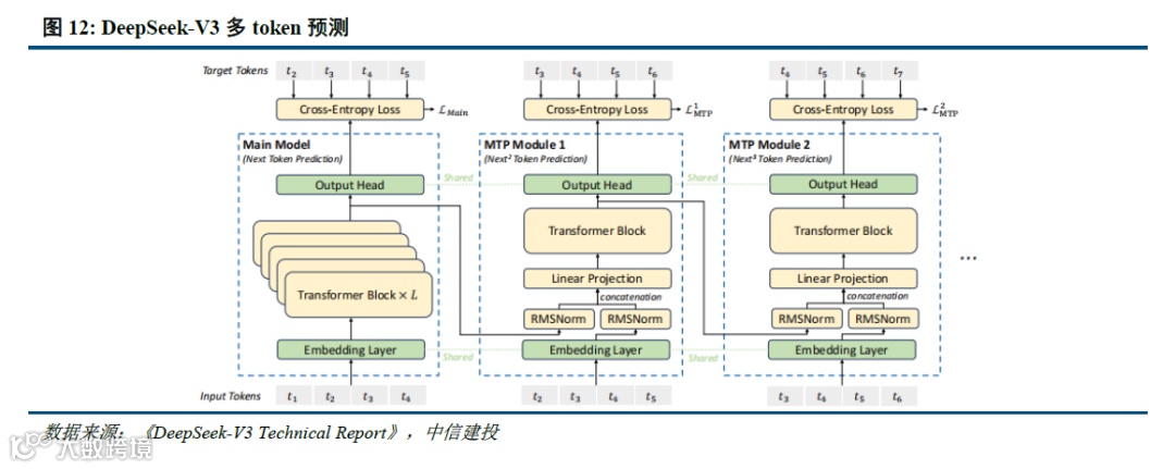 多token预测(MTP):主流大模型token-by-token生成序列,而每次token生成需要频繁与访存交互,从而因为访存效率形成训练或推理的瓶颈。MTP方法主要将单token的生成,转变成多token的生成,提升训练和推理的性能。DeepSeek主要对过往MTP算法进行了一定优化,顺序预测额外token,并在每个预测深度保持完整的因果链。
