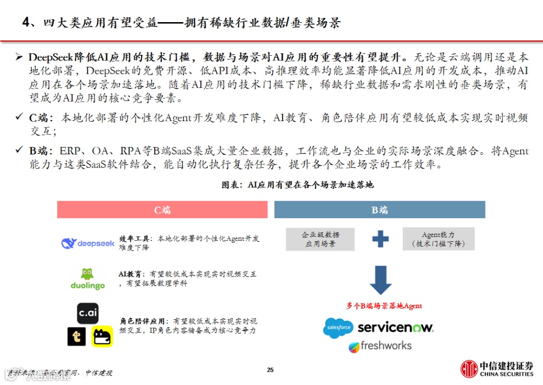 考虑到DeepSeek-R1开发和调用成本本身较低,还通过蒸馏的方式带来了小模型推理能力的提升,则应用开发者能够以更低的成本部署模型或调用API,并保持相对优秀的性能。当应用开发门槛降低,预计会出现更多产品探索方向,直至出现具有突破性的 “killer”应用。同时,DeepSeek-R1的低价,同样有望带来推理模型新一轮的价格战(o3-mini的价格本身已经验证了这一观点),为开发者带来更多性价比之选。最后,当DeepSeek模型的能力达到全球第一梯队后,其作为国内厂商能为国内应用开发者提供更稳定的服务(调用GPT API可能会受到各种限制),亦将促进各类应用产生。