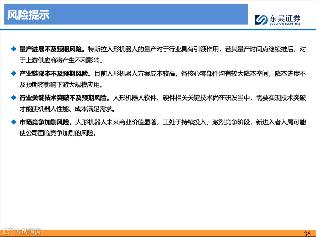 投资建议:机器人当前类比2014年电动车,即将量产,开启10年产业大周期,强烈看好板块!1)T链:首推确定性龙头Tier1【三花智控】【拓普集团】,Tier2【鸣志电器】【绿的谐波】【双环传动】,关注【北特科技】【浙江荣泰】【五洲新春】【斯菱股份】【大业股份】【震裕科技】等;2)HW链:推荐【雷赛智能】【赛力斯】【富临精工】,关注【兆威机电】【蓝黛科技】【禾川科技】【豪能股份】【科力尔】【埃夫特】【拓斯达】等。3)NV链:推荐【伟创电气】【科达利】等。4)宇树:推荐【曼恩斯特】 ,关注【长盛轴承】【卧龙电驱】【奥比中光】。