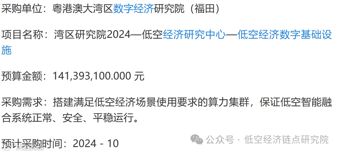 虽然是联合中标,但根据2024 年8月 16 日,粤港澳大湾区数字经济研究院(福田)发布《低空经济数字基础设施》采购意向,见下图,