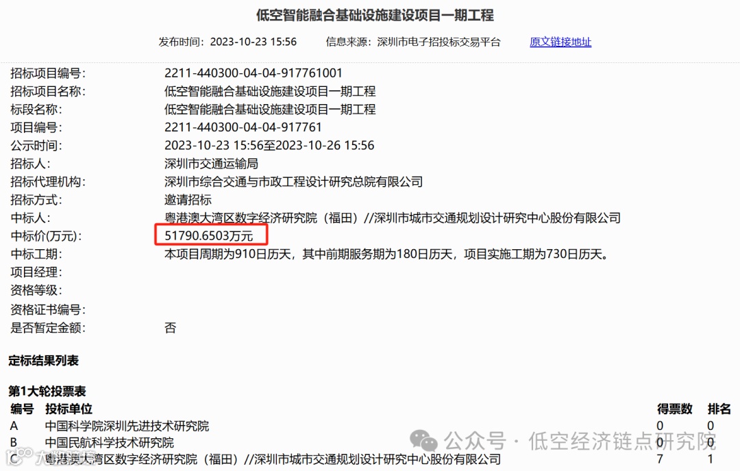 从落地层面来看,深圳已经招标了“低空智能融合基础设施建设项目一期”,总金额为 5.18 亿元,由粤港澳大湾区数字经济研究院(福田)和深城交联合中标,见下图: