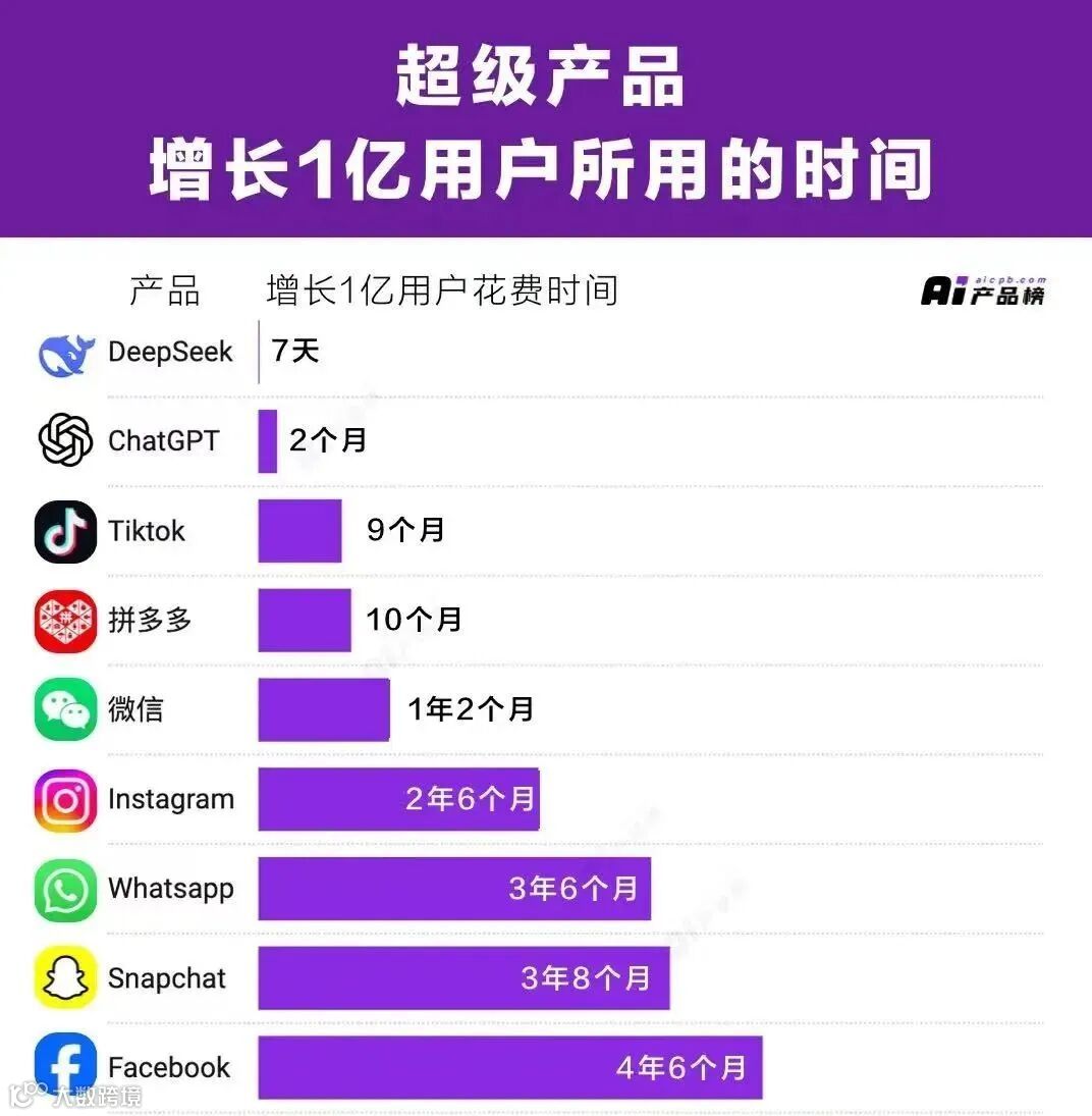 据AI产品榜的数据显示,2025/01/20 DeepSeek-R1 发布几天后,在 1 月的最后一周迎来了爆发,DeepSeek 在 1 月累计获得1.25 亿用户(含网站(Web)、应用(App)累加不去重)。其中 80% 以上用户来自最后一周,即 DeepSeek 7 天完成了 1 亿用户的增长,这是在没有任何广告投放的情况下取得的,成为了名副其实的超级产品。