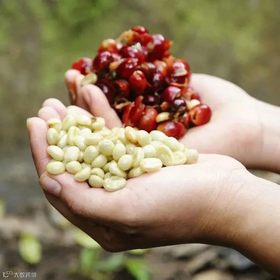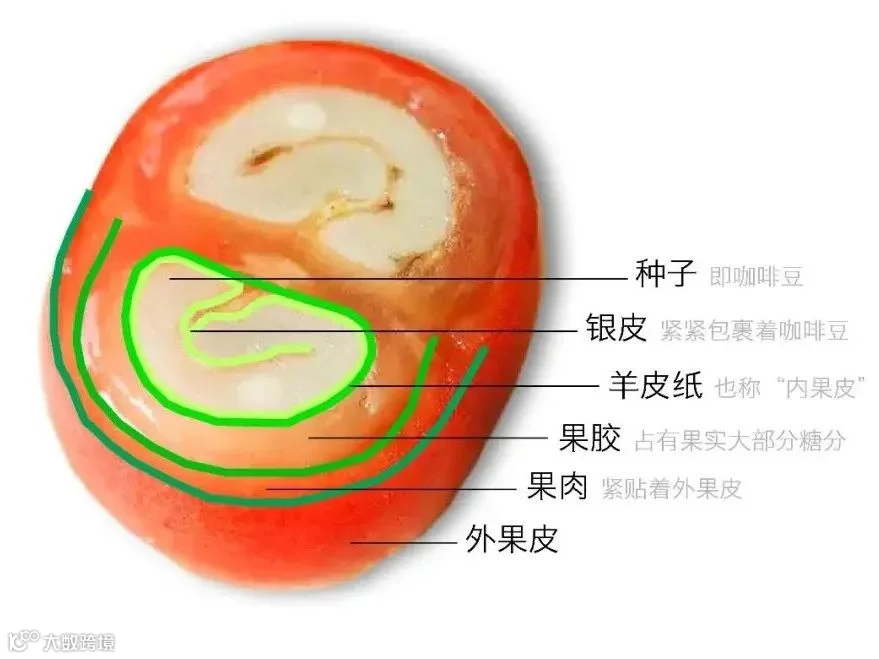 当咖啡豆成熟被采摘之后,其形态是外形类似于樱桃的咖啡果。最外层是果皮,果皮内有一层薄薄的胶状果肉,我们有时也称其为果胶。果胶内是两颗包裹着羊皮层的半圆形种子,这就是咖啡豆。