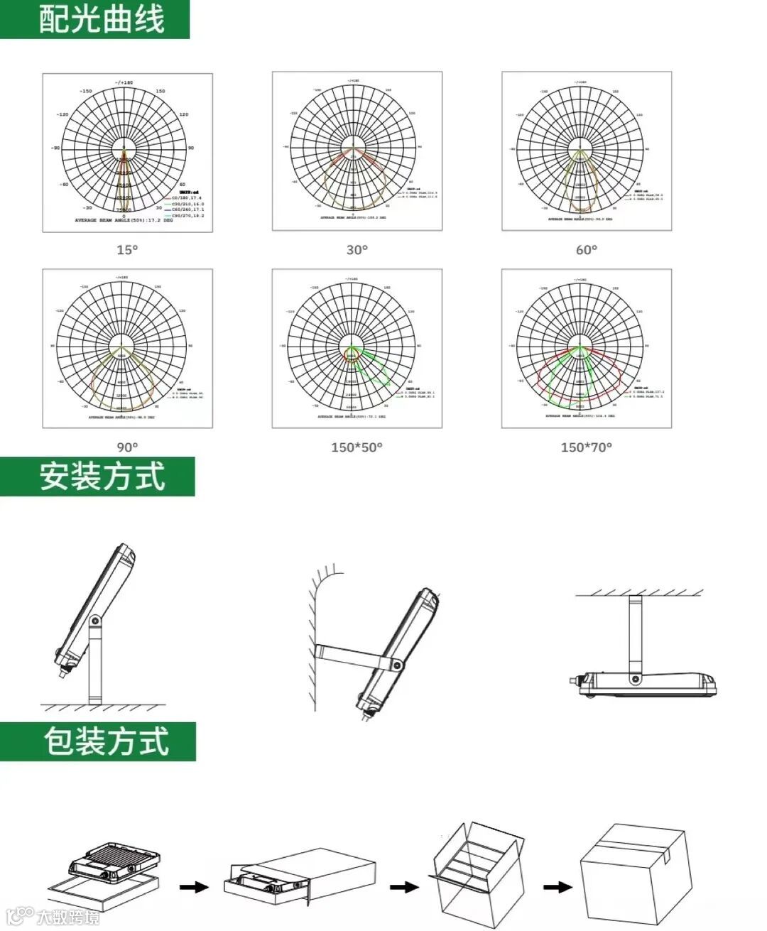 | 4 | 发光角度 | 10°/15°/30°/60°/90°/120°/150°*70°/150°*150°/单偏50 |