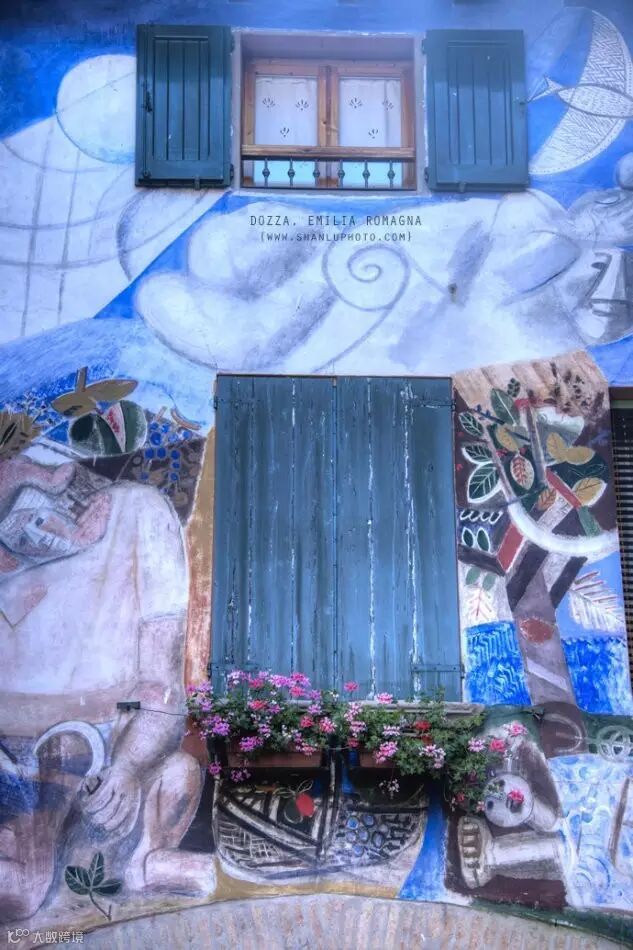 多扎(Dozza)小镇并不大,是一个只有六千六百人口的小城,在去往Dozza小镇的路上,路边都是绿色植物,非常养眼,大自然的亲切感迎面而来。绿影环绕着小镇,鲜花装点着小镇,而壁画则为这一切画龙点睛,古典艺术的气息为小镇增添了一番别致风情。这个中世纪的小镇,因为满城的壁画,完成了完美的蜕变,成为了美丽的户外艺术大画廊。传统的葡萄酒产业产业决定了周围的环境,没有过多的工业污染,加上天然的植物种植,已经是整个小镇最完美的一幅画。