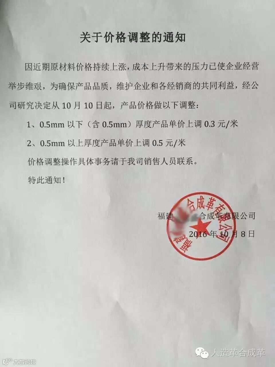 继上个月9月15-20日期间人造革厂家密集发布人造革产品涨价信息后(普遍上调0.5元/米),不到一个月,不少厂家再次发布涨价通知,这轮涨价幅度甚至超过了上一轮(大多上调1.0元/米):