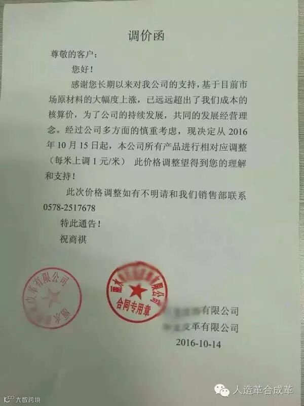 浙江某革厂宣布从10月20日起调价0.5-1.0元/米;