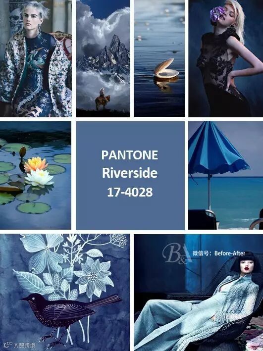 Riverside 河畔蓝是潘通提出的一种新蓝色,乍看之下有着牛仔般舒适的触感,带着一种稳重、平静的基调,位居于秋冬流行色之首。而这也从侧面昭示着在当下花红柳绿的时尚圈冷淡的风潮依然占据着首位。