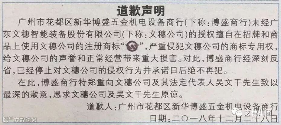 2018年12月28日,南方都市报刊登了一则“商标侵权”的道歉声明:广州市花都区新华博盛五金机电设备商行承认严重侵范广东文穗智能装备股份有限公司(简称文穗公司)的商标专用权并郑重向文穗公司作出道歉声明。