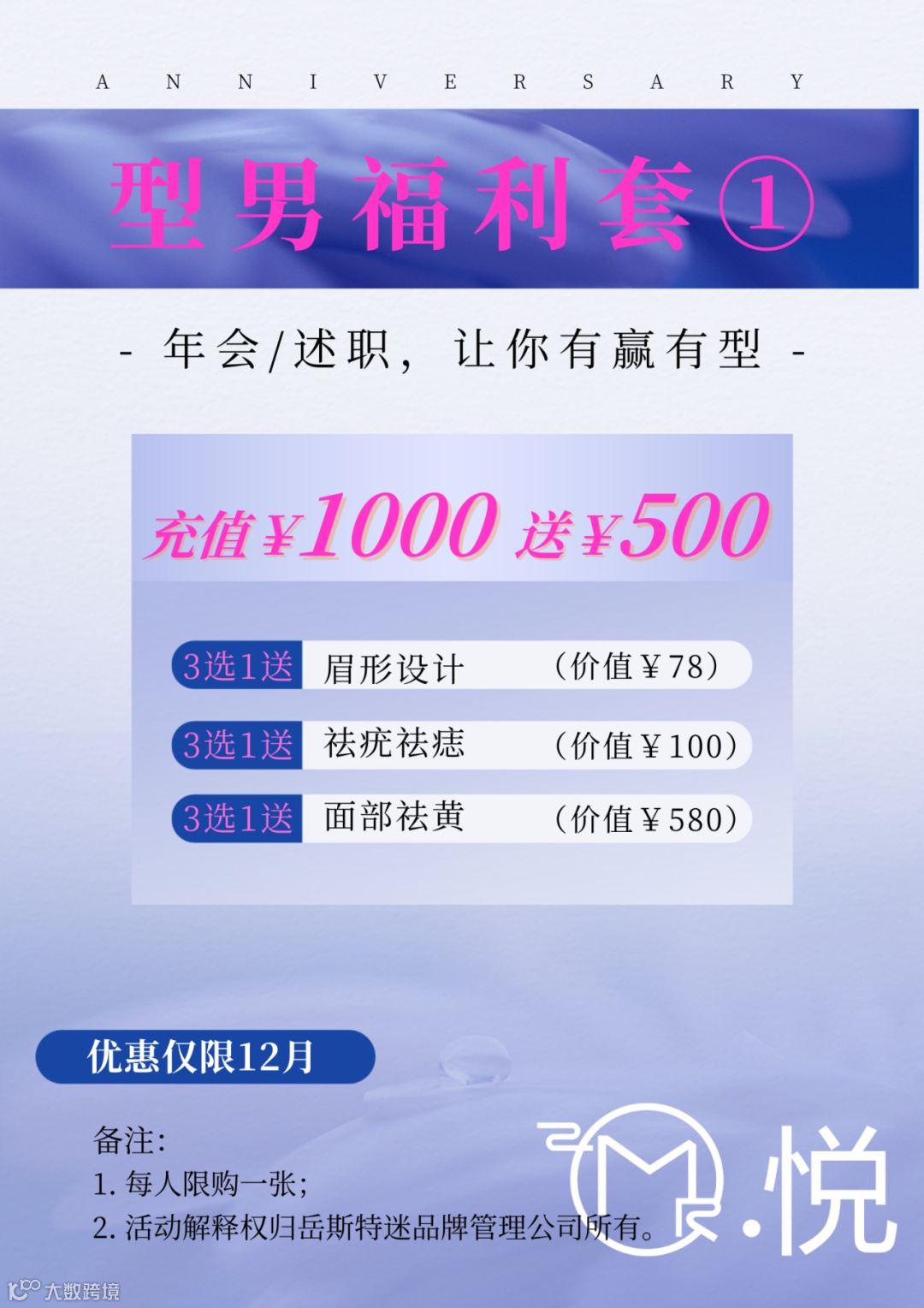 恰逢年底,为支持各位男士在年终述职、年会聚会中赢得更有型,Mr.悦推出12月优惠套卡,包含面部清洁+任意焕肤组合。