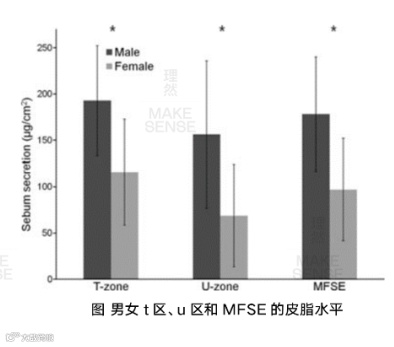 男性因为天生皮脂腺形态更大,所以面部皮脂分泌量高于女性50%,混合空气中的灰尘,