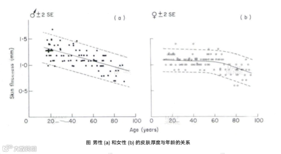 (4)皮肤(表皮层+真皮层)比女性皮肤厚约36%,且男性皮肤变薄(衰老)速度更快