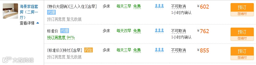1、海景家庭套房 1间1晚(2房1厅,含1.2米和1.8米床各1张);