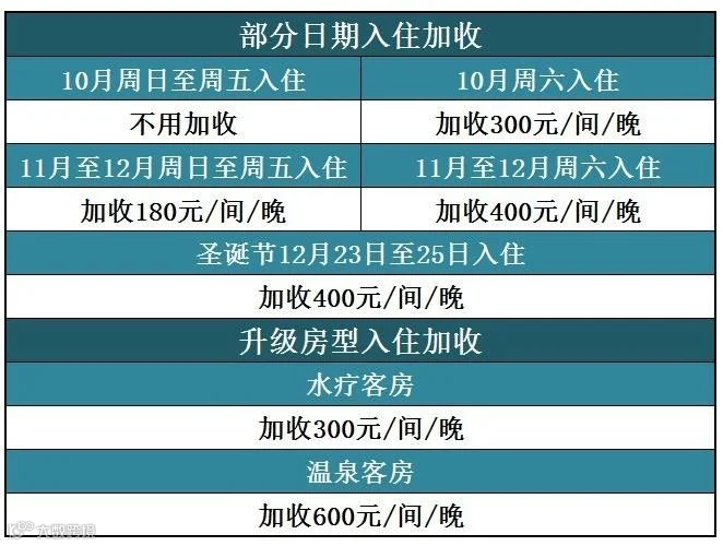 温泉: 1.1米(不含)以下儿童免费(每房仅1位),1.1-1.4米(含)60元/位,超过1.4米以上按成人价120元/位