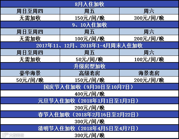 * 部分日期须加收,详细参考下文加收费用说明