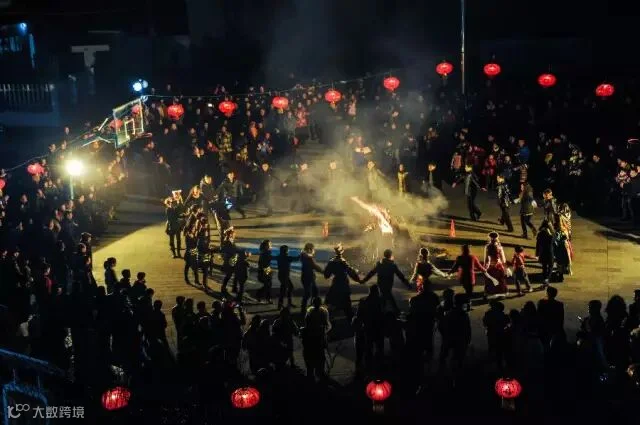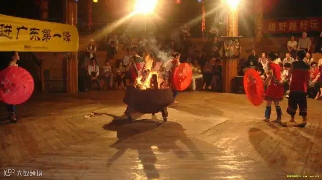 度假区内的瑶寨耍歌堂就会燃起篝火