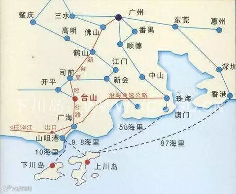 广佛高速→佛开高速(司前出口)→新台高速(南北合出口)→沿海高速→(川岛出口)→山咀港(乘船到下川岛)。