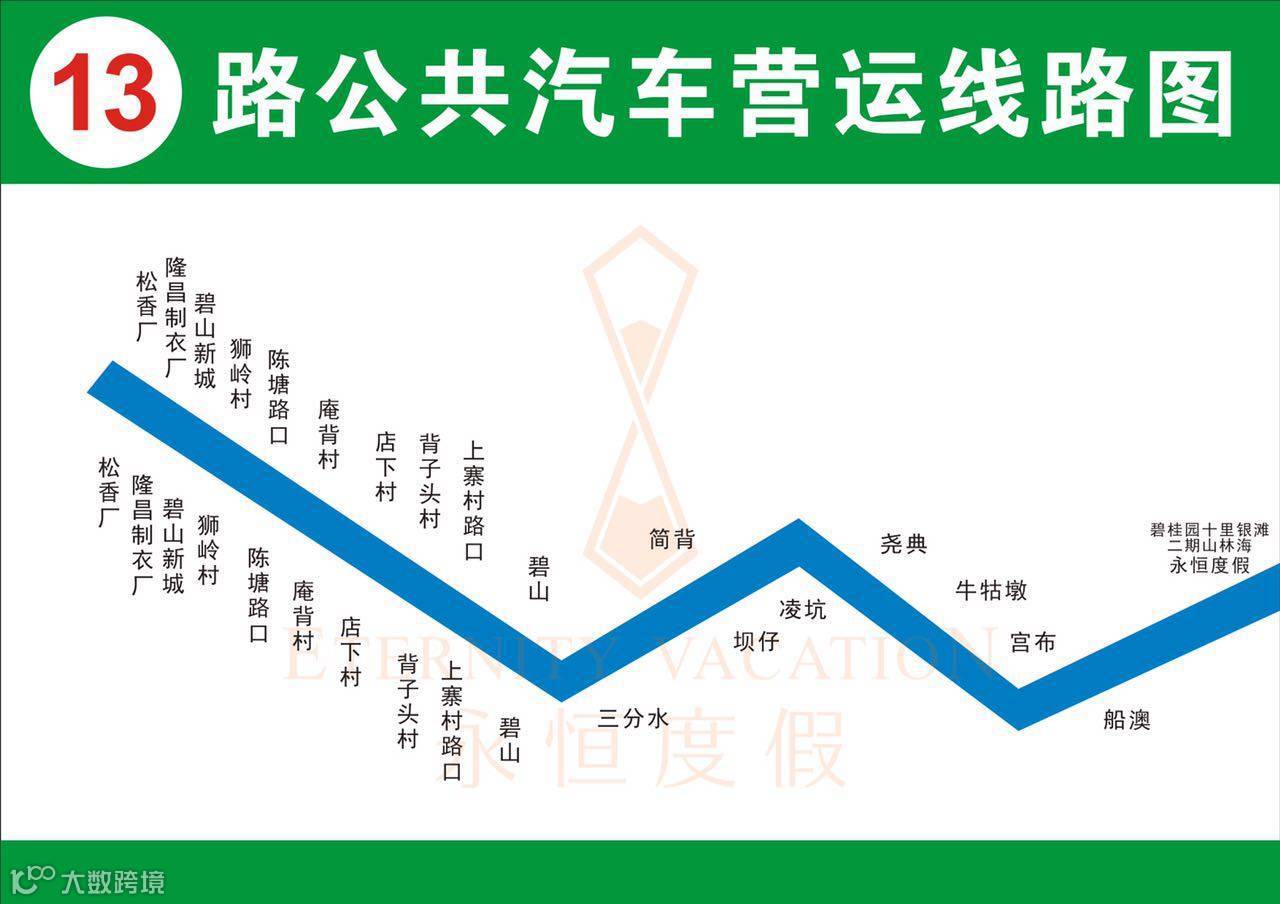 2、转乘公交车:13路公交线路船澳站下车(即碧桂园十里银滩国际学校门口,不用到终点站下车),时长20分钟左右