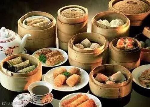 鸡仔饼、豉汁排骨、凤爪、干蒸、烧卖、虾饺、水晶饺、粉果、黑椒牛仔骨、糯米鸡、马蹄糕、萝卜糕、流沙奶黄包、叉烧酥、榴莲酥、腊肠卷、煎堆、咸水角、春卷、凉粉、龟苓膏、双皮奶、姜撞奶、烧鹅、叉烧...