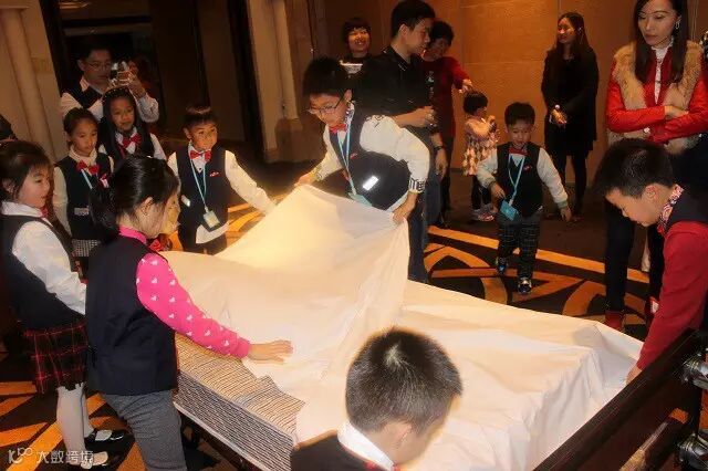★任务二:与客房经理一同学习整理枕头、被子,让小朋友合作完成床铺整理任务,培养营员团队精神及动手能力,毛巾动物折叠为大象、天鹅、蜗牛等随机一到两款),提高小小总经理们的创造能力
