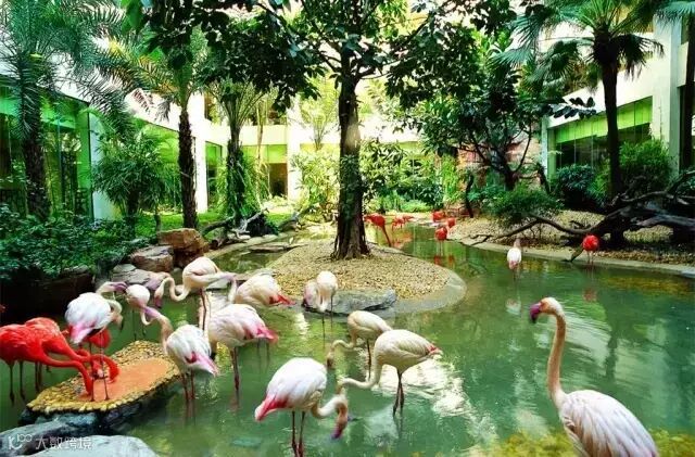 狩猎房——以鱼为主题,室外景观以动物岛的珍稀飞禽为主,白鹤、金刚鹦鹉就生活在触手可及的地方