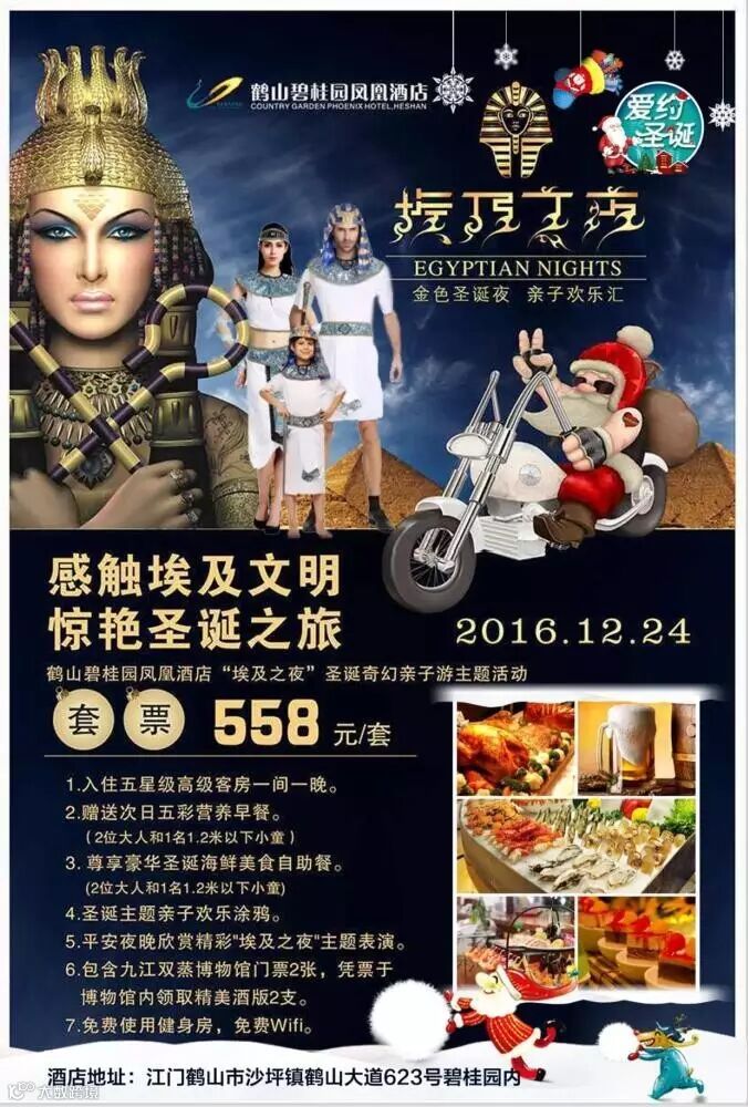12月24日 鹤山碧桂园凤凰酒店“埃及之夜”圣诞主题晚会 盛装启幕…… 超豪华美味节日大餐,炫丽埃及风情演艺, 如此奢华怎能不期待…… ▼