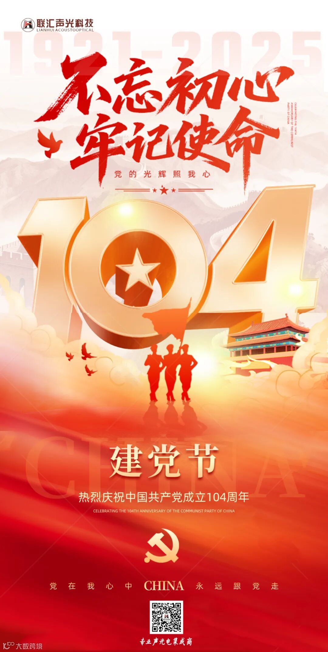 当七月的骄阳洒下炽热光芒,当历史的时针指向这个特殊的日子——7月1日,我们迎来了中国共产党104岁的生日。联汇声光热烈庆祝中国共产党成立104周年,在这个意义非凡的时刻,让我们一同穿越时光长河,重温党的光辉历程,感受信仰的力量,携手奔赴新时代的壮丽征程。