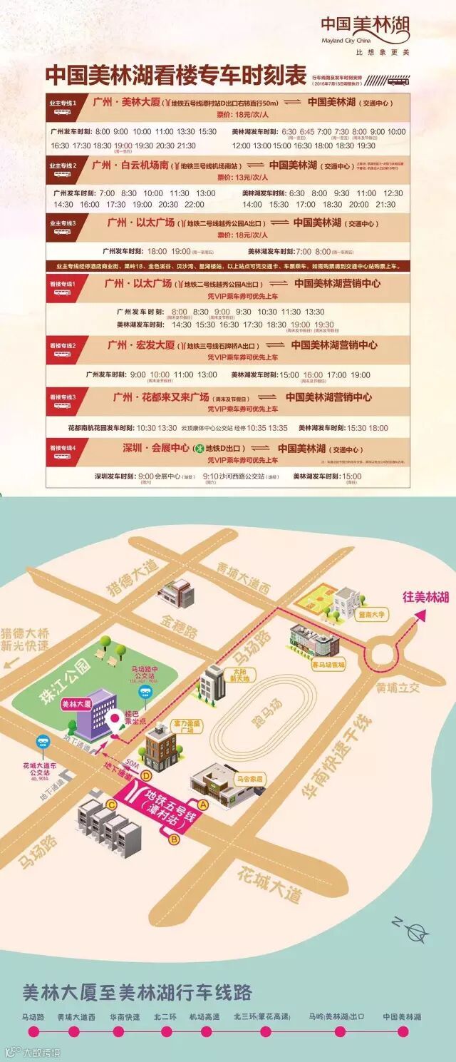 广州市潭村地铁站D出口,有楼巴直送到达美林湖酒店,单程18元/人。