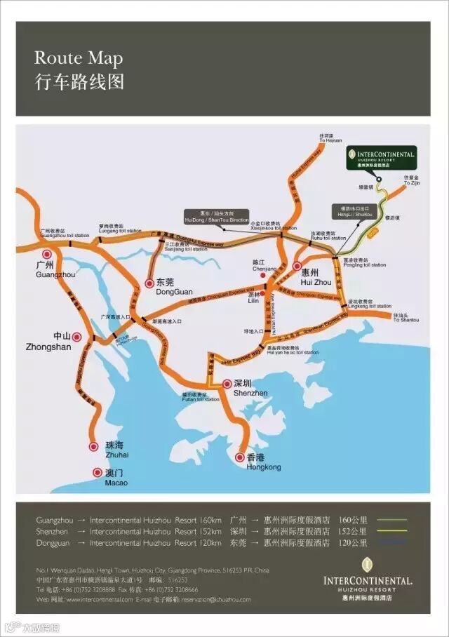 华南快速----转北环高速(深圳方向)--转广深高速---转北二环高速----转广惠高速(往惠东﹑汕头方向)----在横沥水口方向出口(出口收费站是蓬凌收费站)---右转进入省道120(22KM)---惠州洲际度假酒店