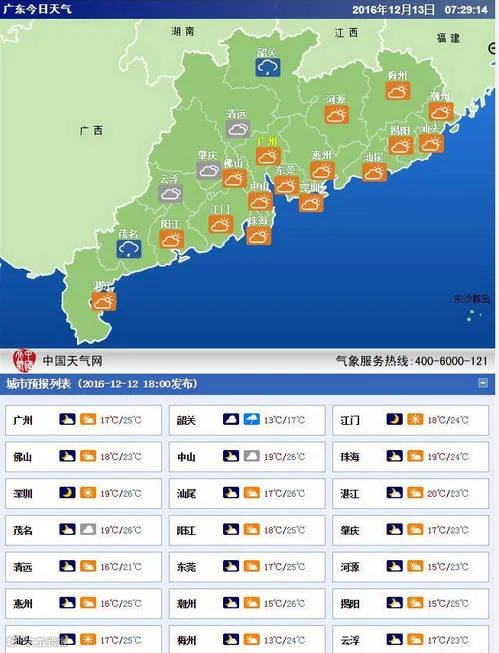 广州市区:13日,阴天间多云,早晨有轻雾,17℃~24℃;14日,阴天到多云,15℃~20℃;15-16日,晴到多云,9℃~18℃。