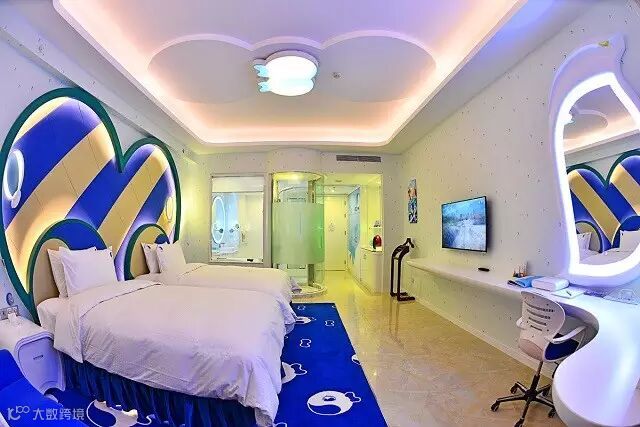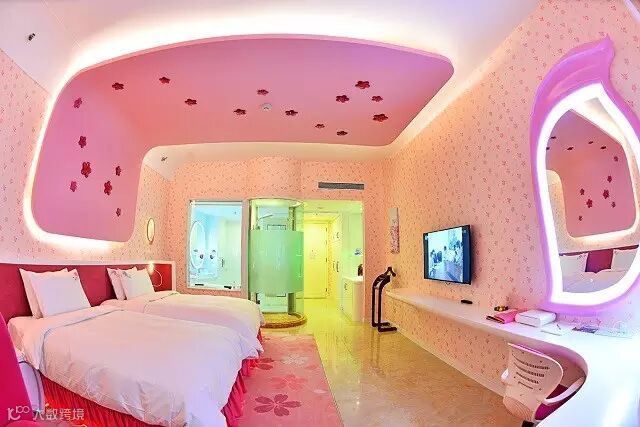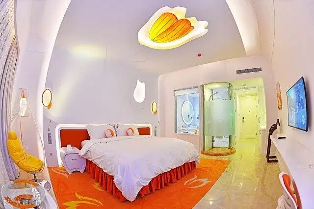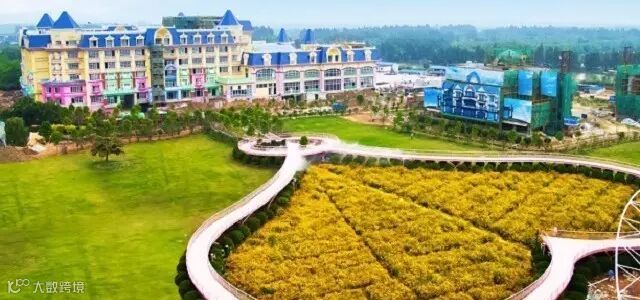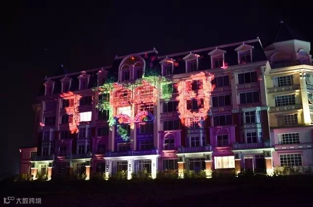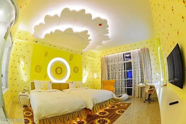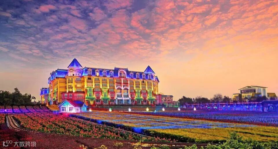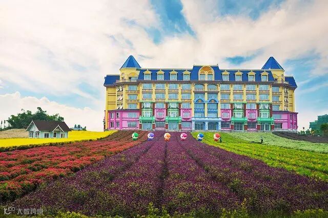 在欧式城堡的尖屋顶下,各种缤纷的色彩装饰着屋檐、墙体、窗棂、门框,呼应着酒店建筑外环绕着的百万花田,置身其中,仿佛走进了安徒生童话……