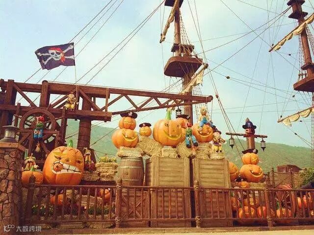 万圣期间,海洋王国随处可见南瓜、海盗及骷髅造型的主题拍照点。