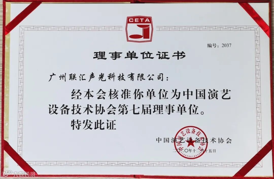 2020年12月15日,中国演艺设备技术协会在广州番禺祈福会议中心顺利召开第七届第一次会员代表会议暨理事大会。联汇声光科技非常荣幸地再次被任命为理事单位。此次会议还对2019年度协会的工作作出总结与表彰,薛建忠先生(广州市办事处副主任、联汇声光总经理)被评为2019年度优秀管理工作者。