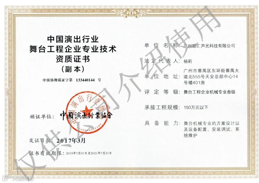 中国演出行业协会舞台机械专业设计安装检测三级资质