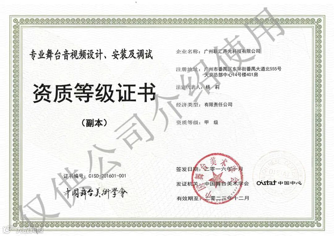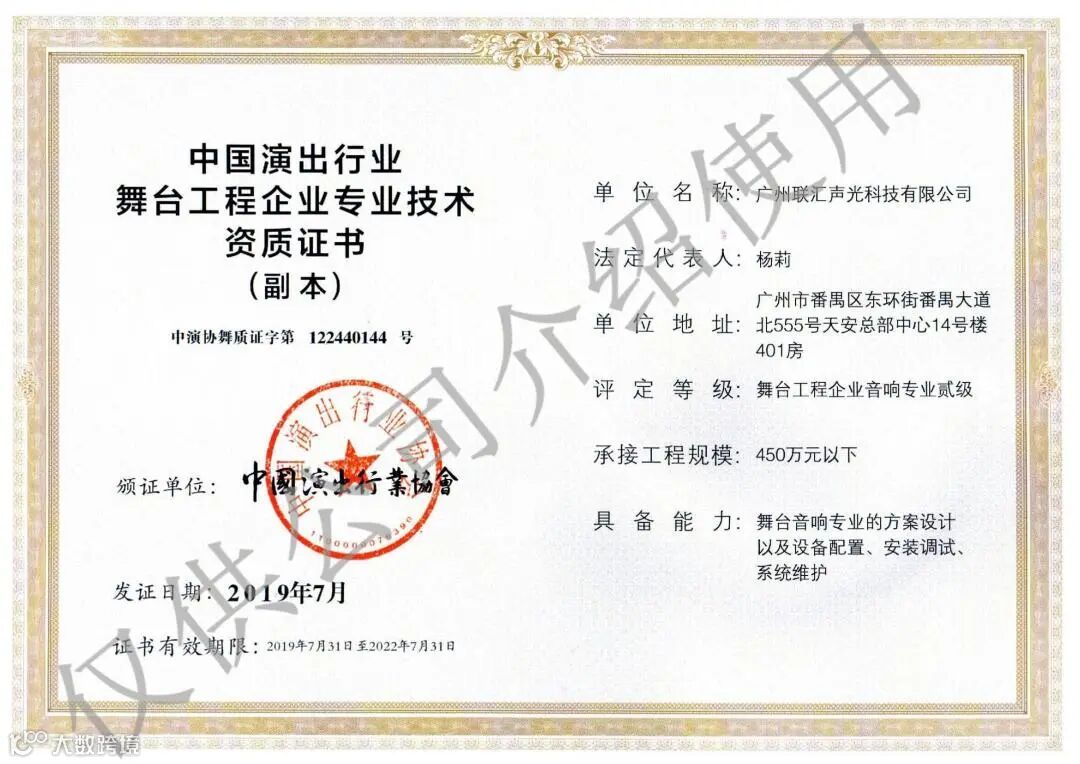 中国演出行业协会舞台音响专业设计安装检测资质二级