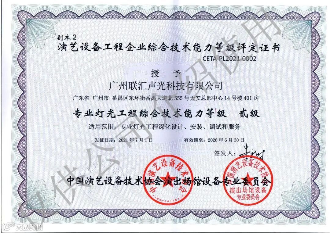 中国演艺设备技术协会专业灯光工程综合技术能力等级资质二级