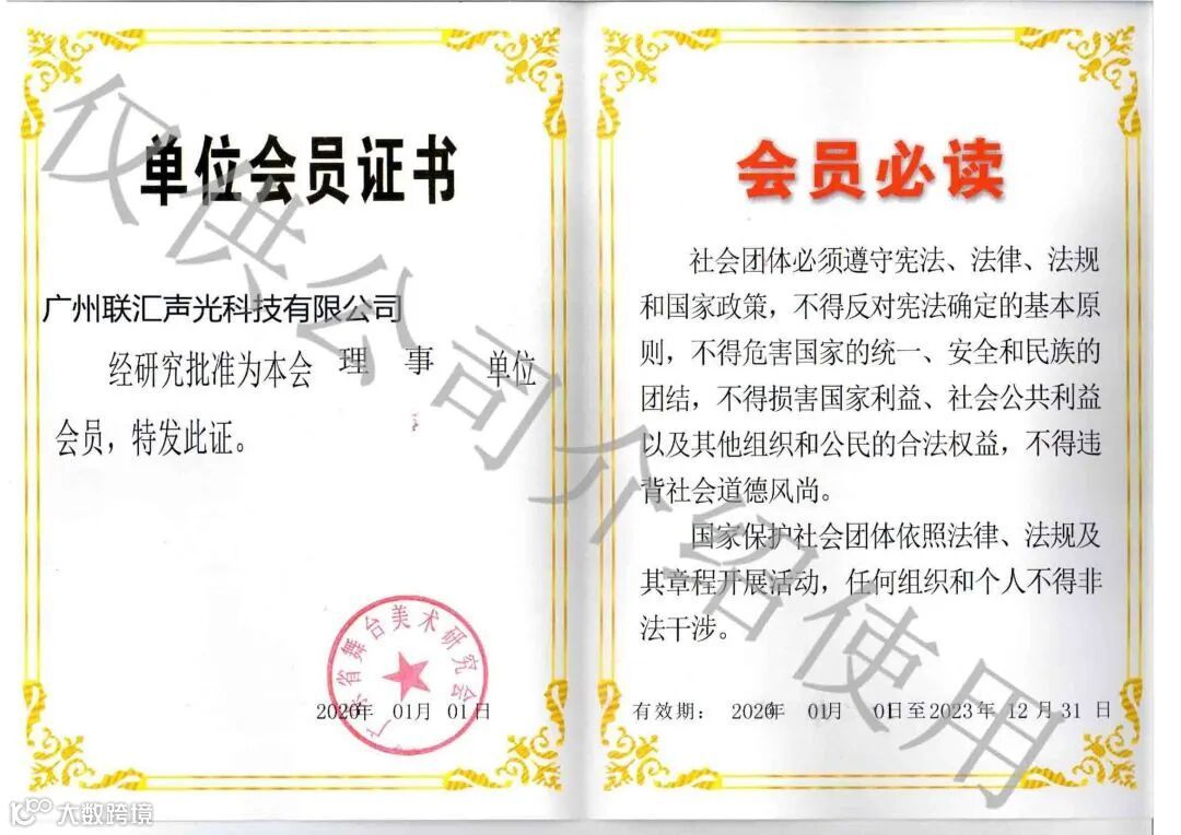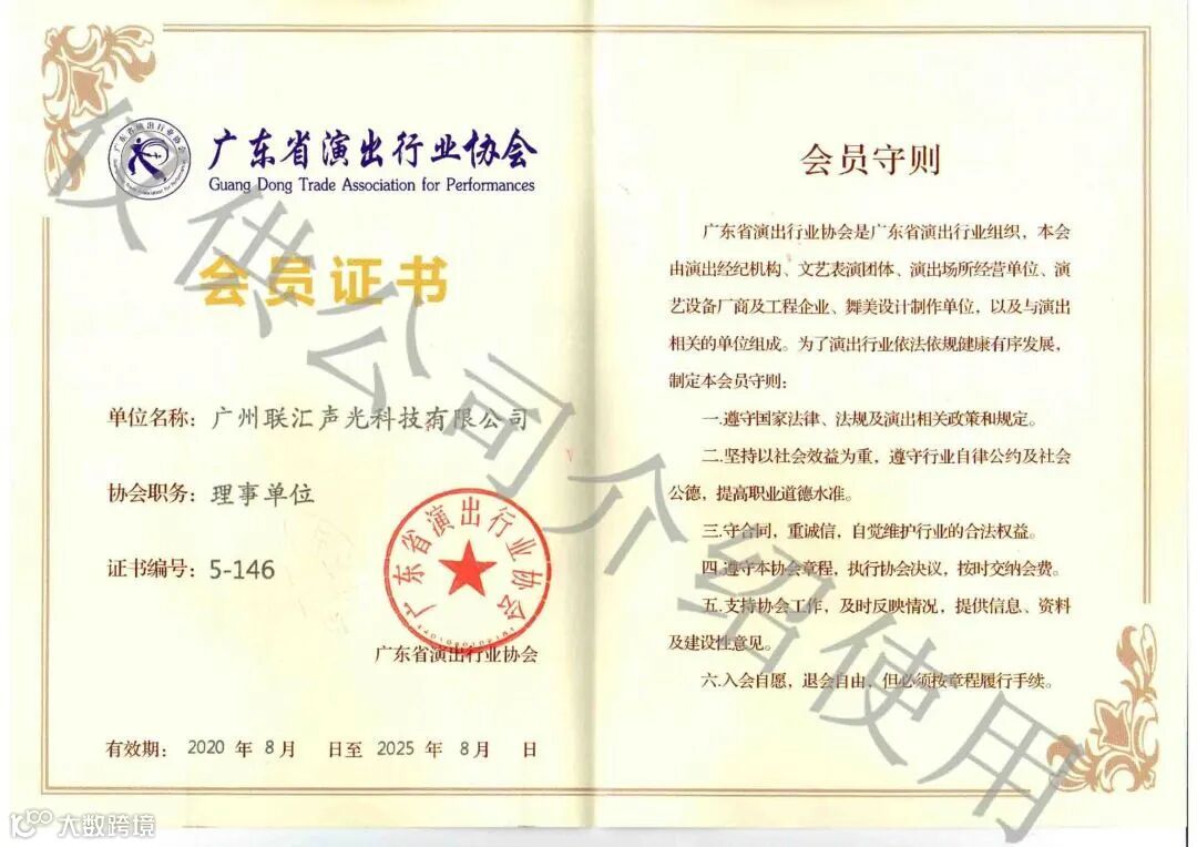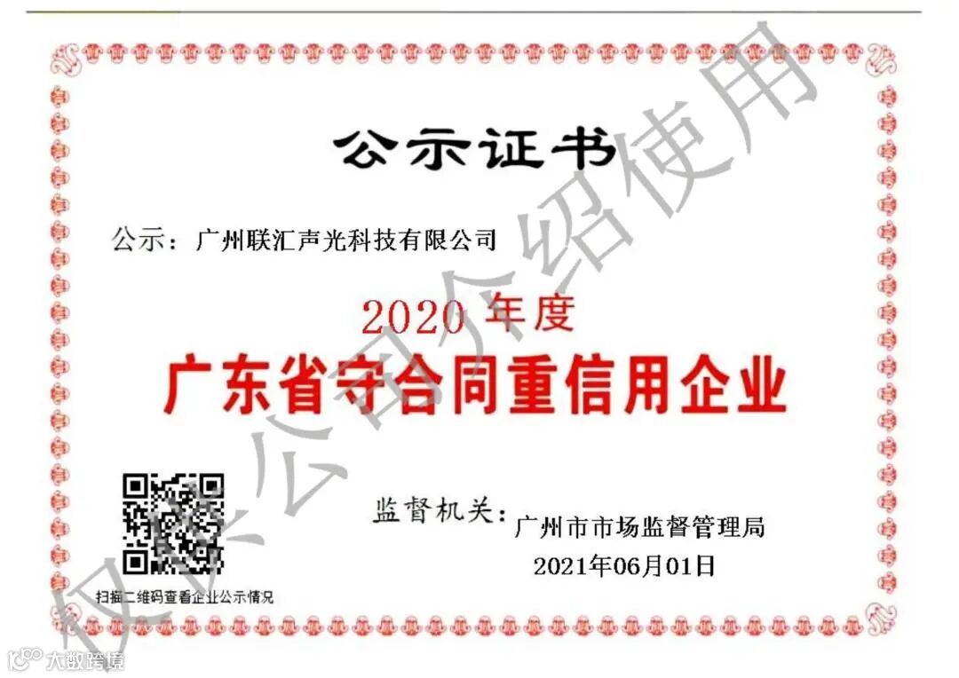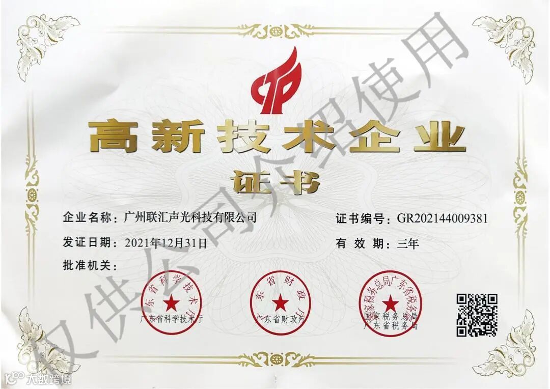 科技成就声光之美!联汇声光多年来不断吸纳行业精英和人才,公司现已拥有一批专业从事声光电集成系统产品研发及工程应用的技术人员,为联汇成为中国最卓越的声光电系统集成供应商提供了最专业有力的技术支持。在声光电系统集成服务上获得了行业协会的高度肯定,现广州联汇声光科技有限公司拥有以下资质证书、荣誉证书: