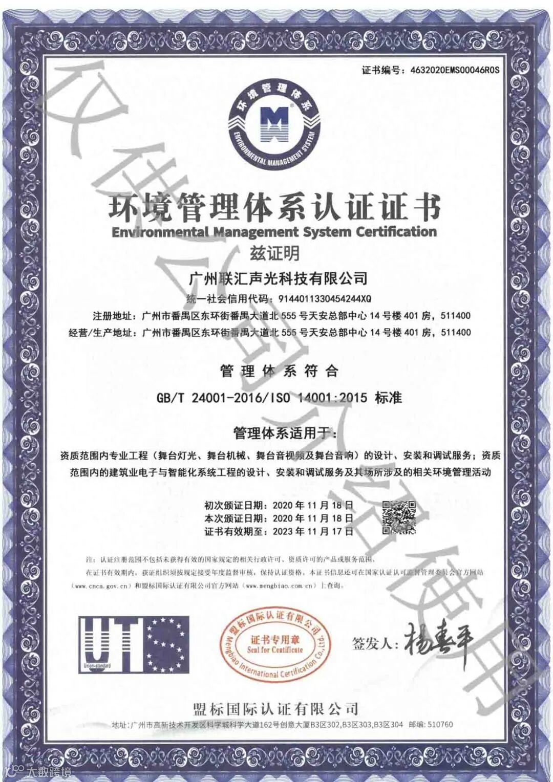 ISO 14001环境管理体系认证证书