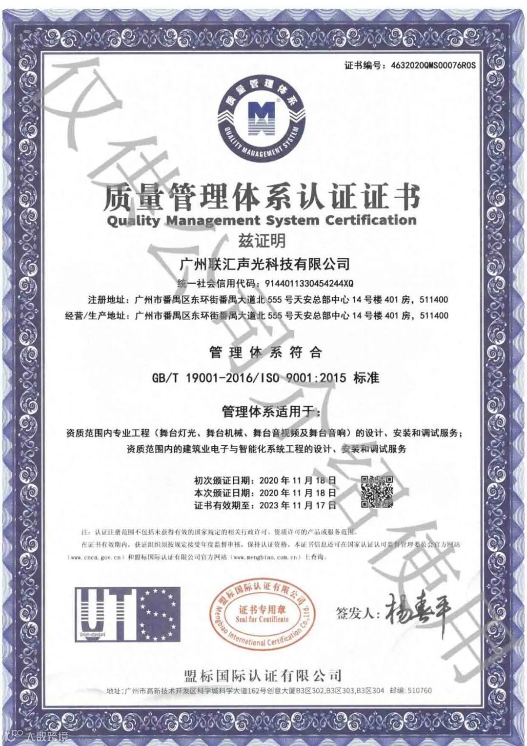 ISO 9001质量管理体系认证证书