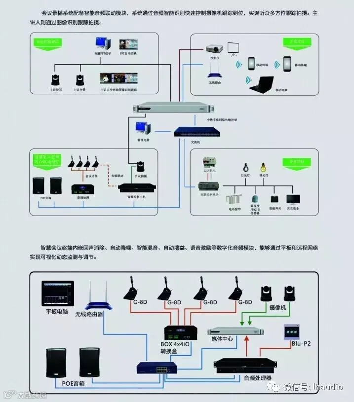 广州联汇声光科技有限公司今年全新推出Dante智能交互式音视频会议系统,让会议变的更高效,Dante数字音频传输技术是一种基于3层的IP网络技术,为点对点的音频连接提供了一种低延时、高精度和低成本的解决方案[4][5]。Dante技术可以在以太网(100M或者1000M)上传送高精度时钟信号以及专业音频信号并可以进行复杂的路由。与以往传统的音频传输技术相比,它继承了CobraNet与EtherSound所有的优点,如无压缩的数字音频信号,保证了良好的音质效果;解决了传统音频传输中繁杂的布线问题,降低了成本;适应现有网络,无需做特殊配置;网络中的音频信号,都以“标签”的形式进行标注等。同时具备自身独特的优势。