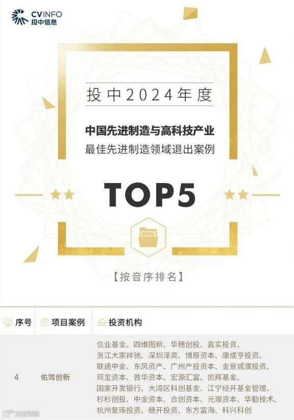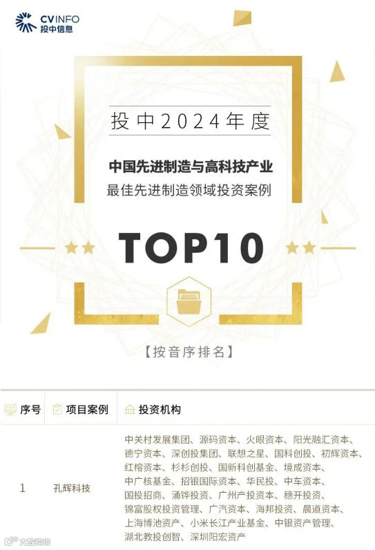 此外,已投企业佑驾创新(02431.HK)和孔辉科技也登上了本届投中榜,分别荣获“投中2024年度中国先进制造与高科技产业最佳先进制造领域退出案例TOP5”和“投中2024年度中国先进制造与高科技产业最佳先进制造领域投资案例TOP10”。